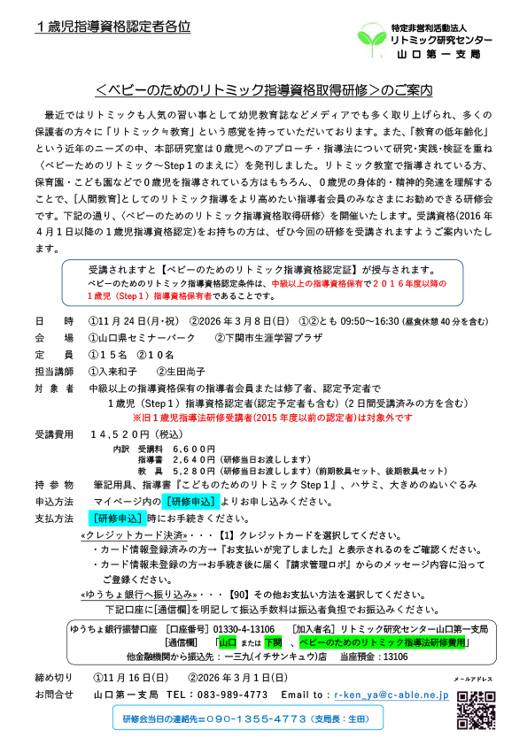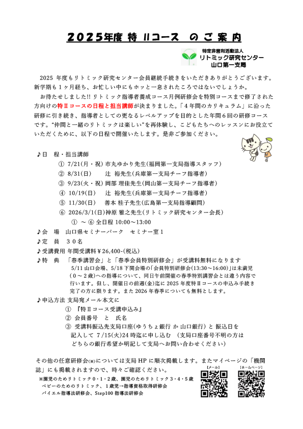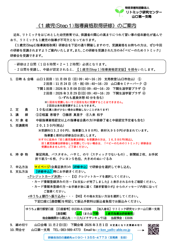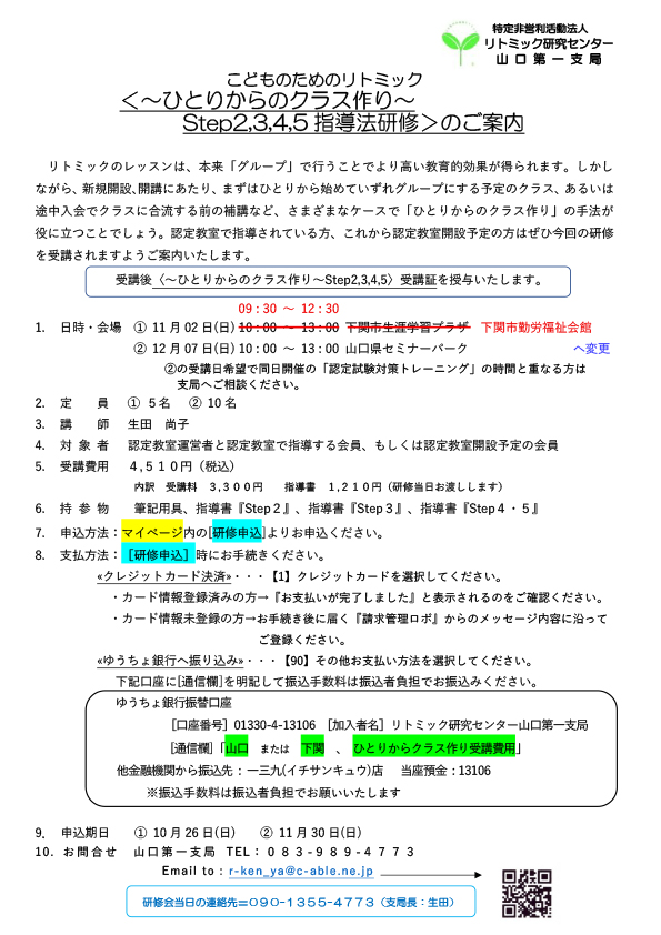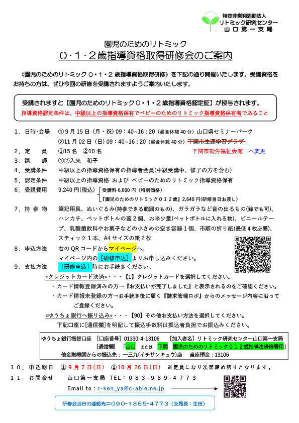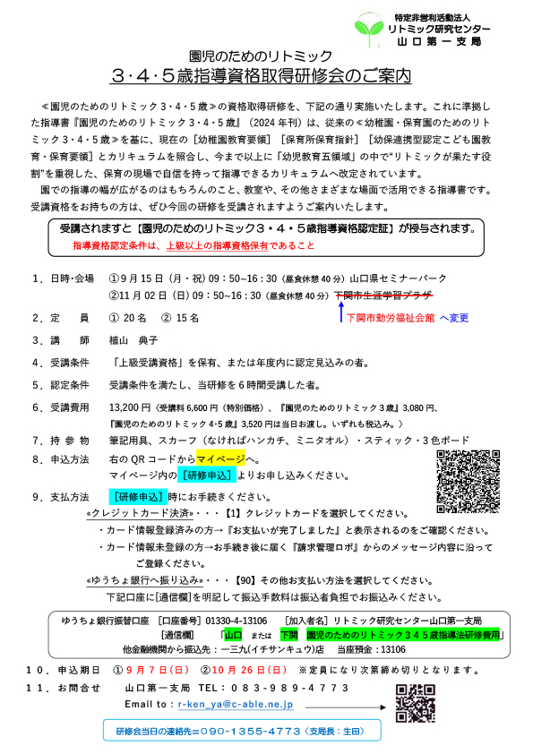 また、『こどものためのリトミック』コースであれば山口第一支局は山口会場と下関会場のどちらへでも振替受講が出来ます。