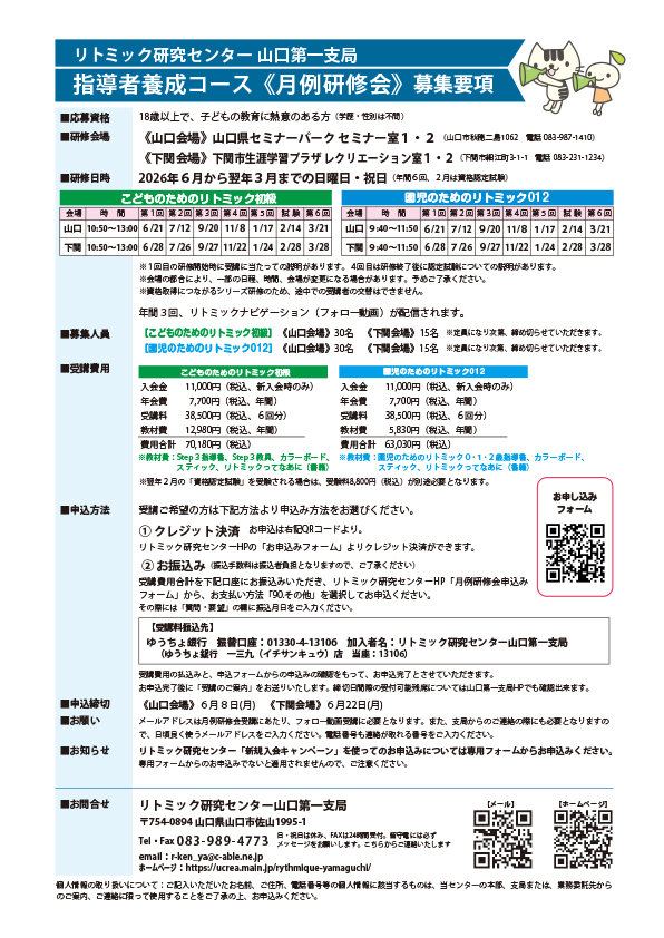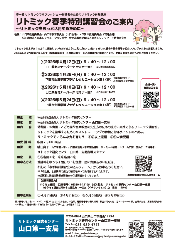 ■山口会場 2026年度「園児のためのリトミック」 会場:山口県セミナーパーク(山口県山口市秋穂二島1062番地)